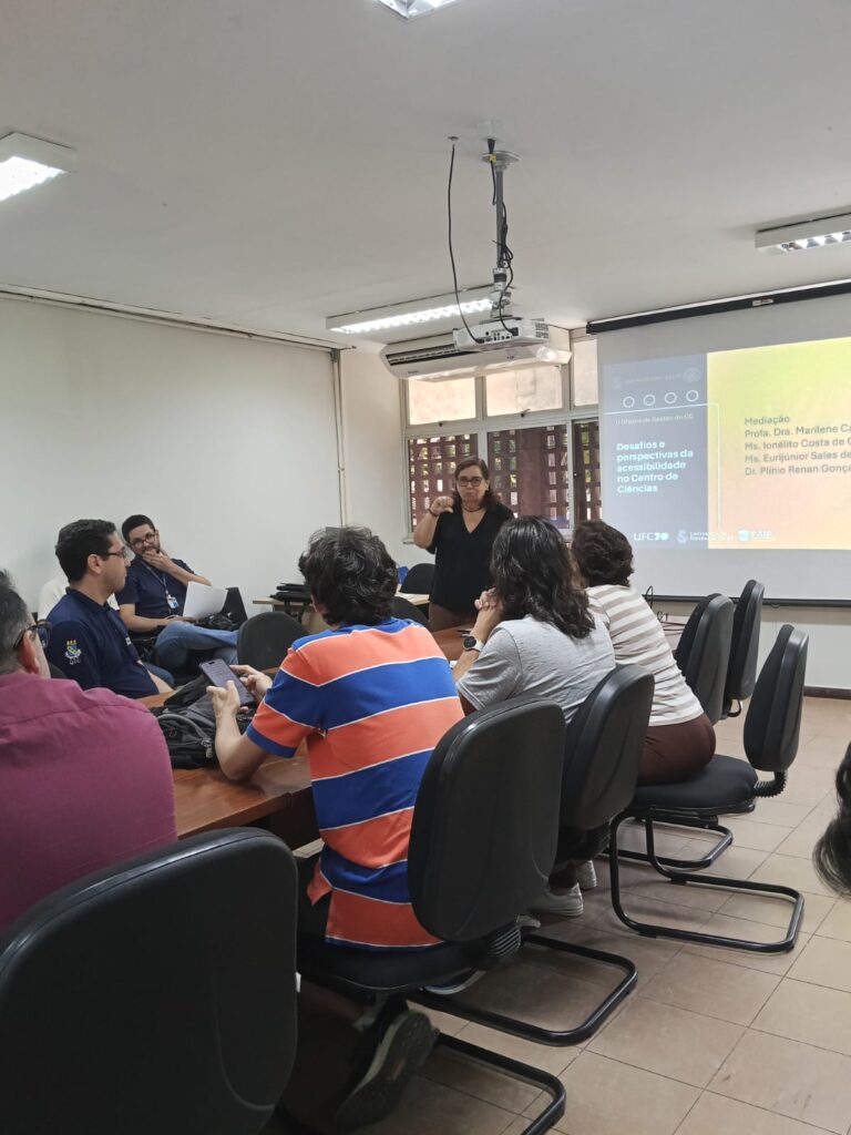 Esse segundo encontro contou com a participação da Profª. Marilene Calderaro da Silva Munguba , Diretora da Secretaria de Acessibilidade da UFC, e também da mediação dos convidados Ms. Ionélito Costa de Oliveira, Ms. Euri júnior Sales de Souza, Dr. Plínio Renan Gonçalves da Silveira, abordando o tema: “Desafios e perspectivas da acessibilidade no Centro de Ciências”. Desenvolvendo um debate enriquecedor e esclarecedor para todos que estavam presentes.