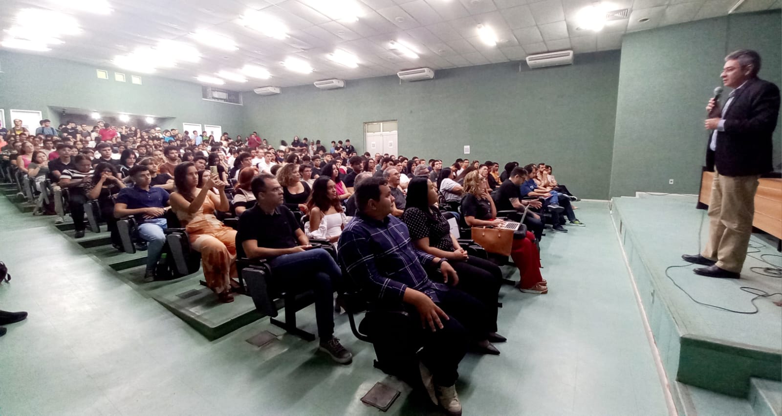 Ao final da recepção geral, os ingressantes foram convidados a seguir para momentos específicos com seus respectivos coordenadores e vice-coordenadores de curso. Esse segundo momento permitiu que os calouros tirassem dúvidas pontuais sobre suas matrizes curriculares e rotinas acadêmicas.